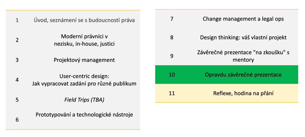 When I presented the prototype, I got back three key extremely helpful improvement points: be more specific, strip the jargon and the English (using Czenglish is a well-documented vice of mine AND there is no way how to call legal design in Czech), and include some examples of the final projects.