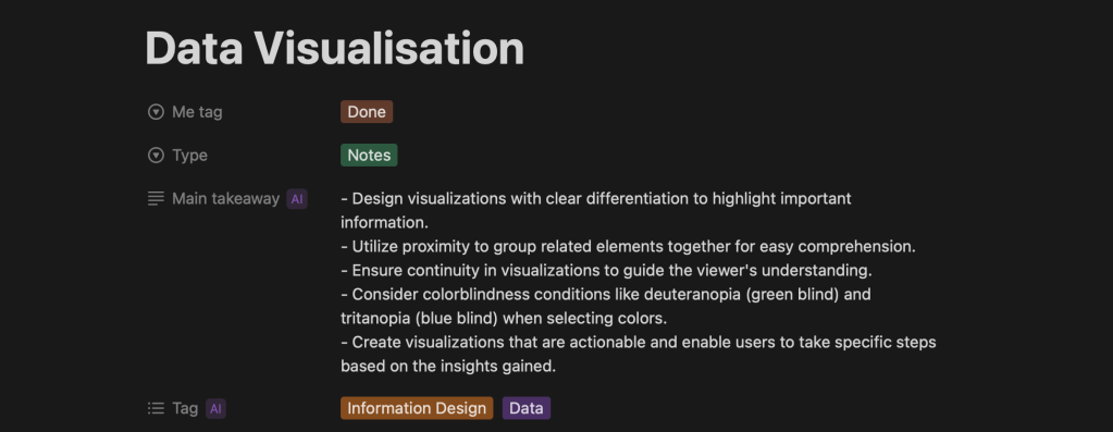 Then Notion released its Generative AI features. After some iterations, I started using NotionAI to assign tags, make summaries, and derive questions on the topic of the note to think about later.