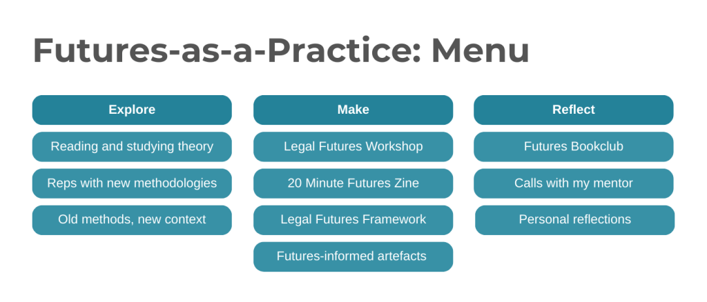 As a steward of carrying over futures and design methodologies, a key concern is combining the best of both into a tailored process that will reflect the idiosyncrasies of the legal system with the intellectual space of the futures studies.